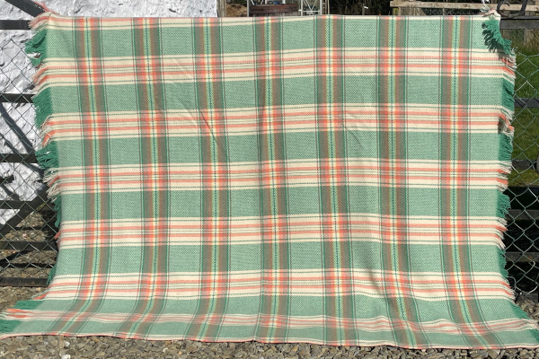 WELSH FRINGED BLANKET IN GREEN WITH PINK AND CREAM