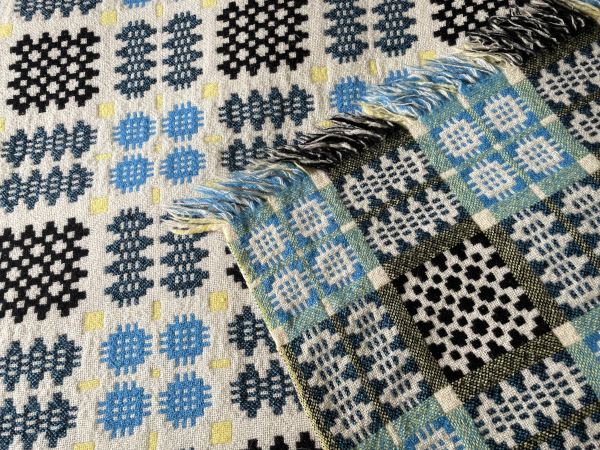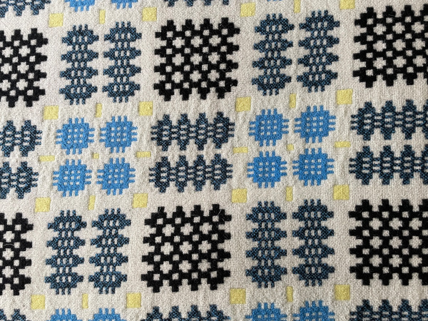 Vintage Welsh Tapestry Blanket. Blue with a touch of yellow and black and cream.