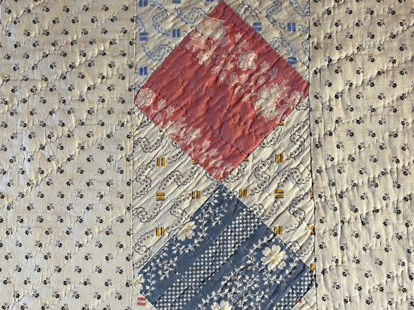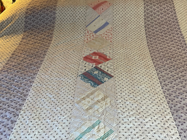A central strip of colourful patchwork squares on point . Reverse is a white Victorian cotton.
