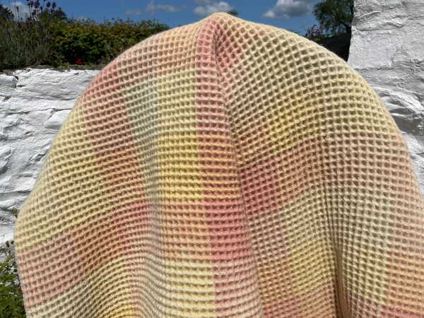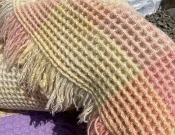 Welsh honeycomb blanket in very pale pink and yellow with a hint of pale blue.
