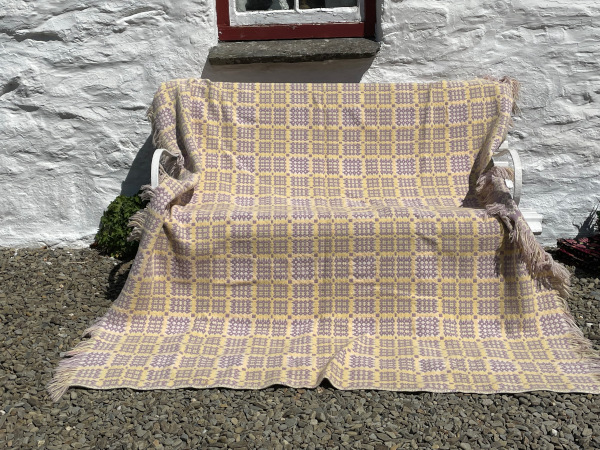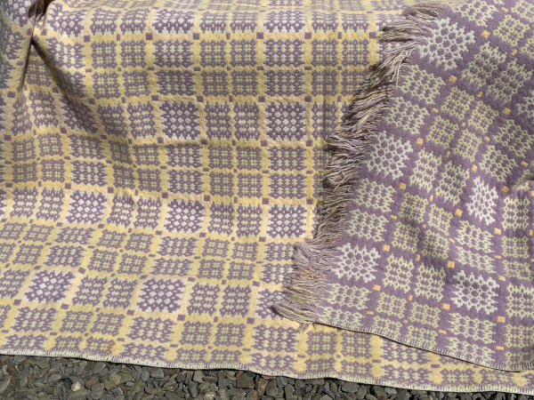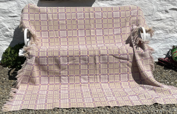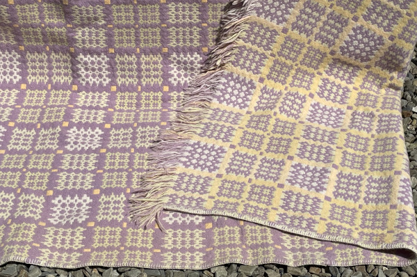 A gentle mix of lavender with pale apricot , yellow and cream, Welsh double weave from the mid twentieth century.