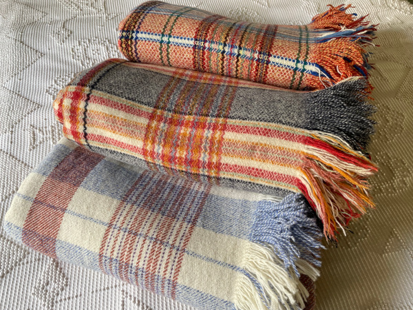 Red and gold mingle creating a tan , cream with a bright blue then multicoloured cross over stripes