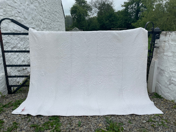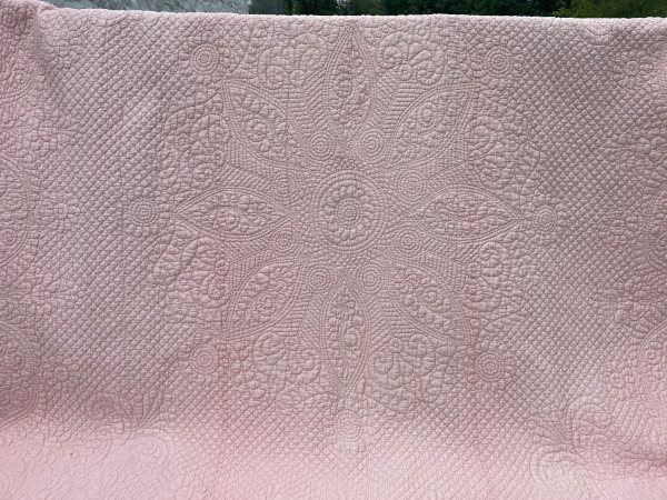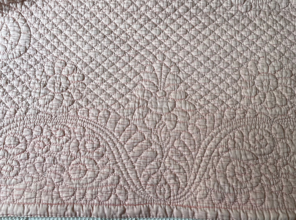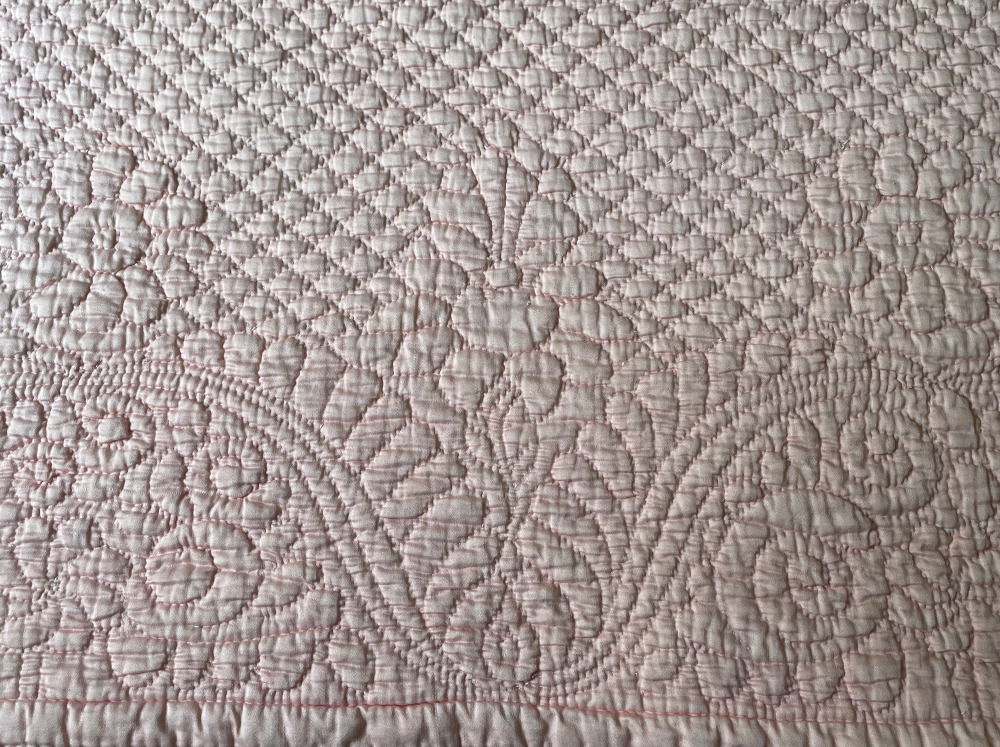 The hand quilting is typical of that from the Allendale region of Northumberland . Complicated and elaborate with a large central motif , which integrates into diamond infill . A wonderful outer border of swags and Fleur de lys